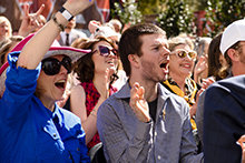 An elated crowd hails a ribbon-cutting in the capital city, celebrating Texas freedom on the city’s main social corridor, The Drag.